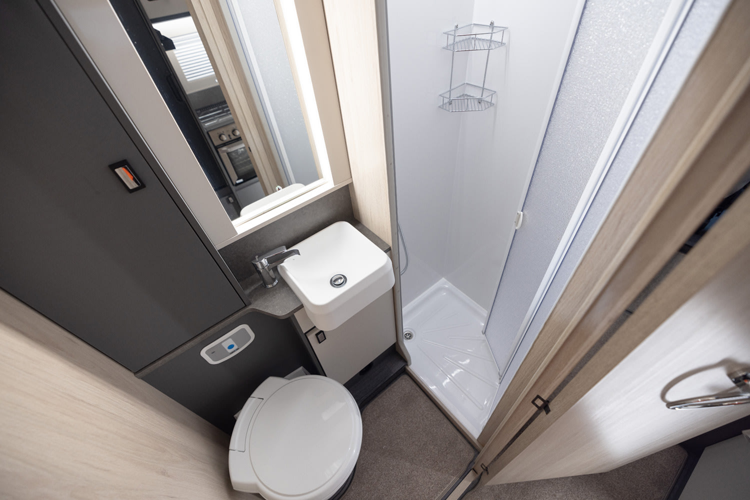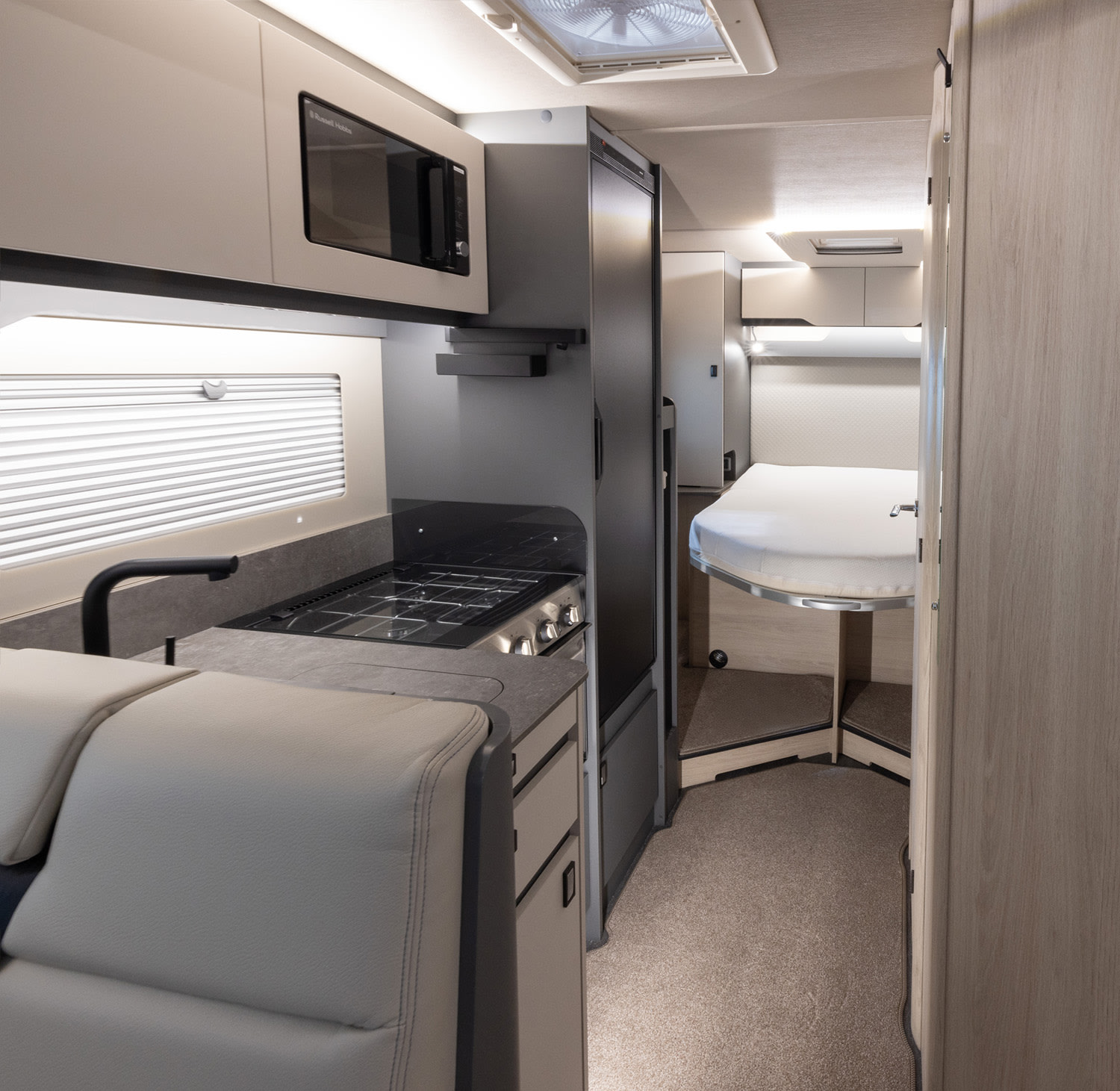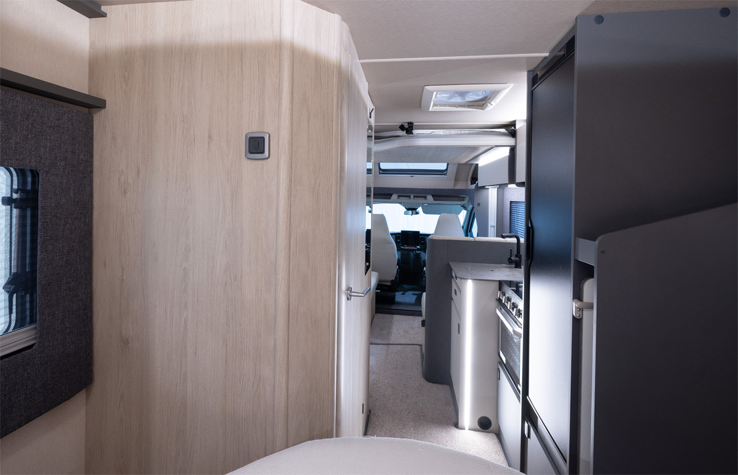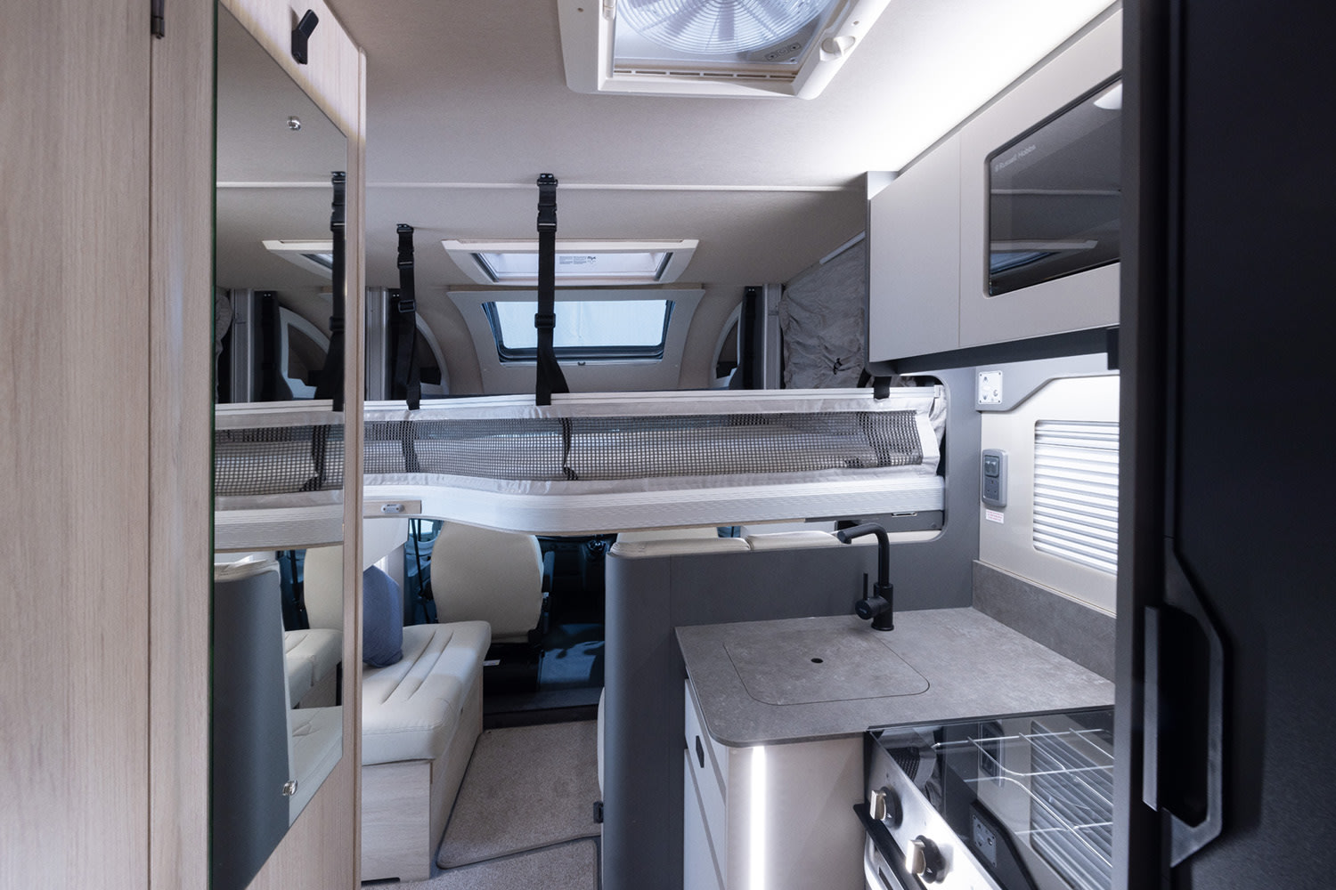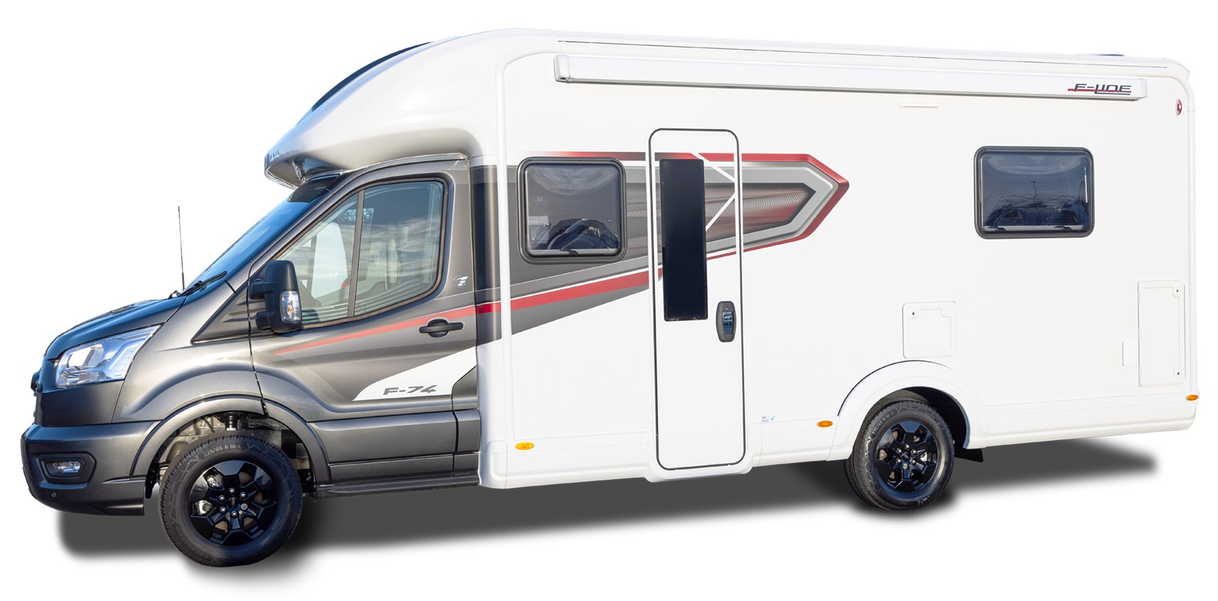 Make a statement with the brand new layout in the F-Line range – The F-74. Built on the latest 2025 EcoBlue New Ford Transit camper specific chassis with a 165 bhp engine, automatic gearbox and panoramic skyroof. Incorporating numerous practical features for your holidays away, the new 7.32m F-74, low-profile coachbuilt delivers a spacious front living area and large island bed at the rear. The popular and integrated electronic dropdown bed is a massive bonus taking this van upto 4 berths. Once made the beds are do not need re making nightly to make bedtime that much easier. These motorhomes are complemented by plenty of LED lighting as well as natural light throughout for a clean, modern feel inside this family motorhome. For an easy way to control your living environment, 2022 F-Line models feature the new Whale Heat Air space and Expanse water heating, featuring the easy to use Heat Control panel. This chassis mounted system, creates valuable storage and extra living space. Explore even further.