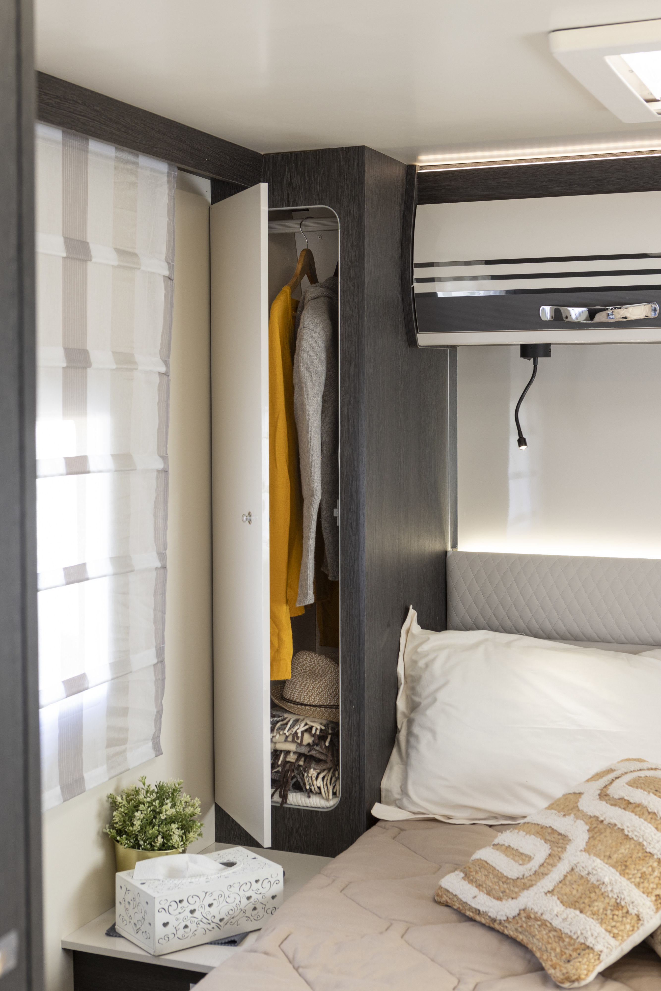 Get the five-star hotel feeling in the Zefiro 696. A rear island bed with under bed storage, bedside tables and two wardrobes all closed off by sliding to door give a level of privacy and peacefulness usually only ever dreamed of when away in a hotel. Just in front of this, you’ll discover the domestic style shower cubicle separate from the remainder of the bathroom. The popular L-shaped lounge area, dressed in fine marta soft furnishings, creates seating for up to five people during the day, offering a homely space for relaxing and entertaining. Come night-time, a second double bed from the delicate body curves of the Zefiro 696 lowers down above the lounge using a smooth, electric mechanism. This motorhome on order comes with: 4 Berths, 4 Travel seats, Automatic, Electric drop down bed, Isofix, Sat Nav Pioneer head unit, Cab Blinds, Fresh and waste water tanks, gas and electric blown air heating, Blinds + Flyscreens, Bike Rack, Reverse camera, Solar Panel, smart TV, Driver + Passenger airbags, Swivel seats, Awning Light, Skylights, Heated front windscreen, 3 way fridge freezer, oven/grill, TV Prep point, Large Garage, 4G WIFI, Automatic, Electric Flex Space bed, 3 x gas hobs, Awning light, New Drivers pack containing: 165BHP Engine upgrade, Moondust Silver cab, 16″ Alloy wheels, Locking Glove box, Full colour bumpers and side mouldings, high series headlamp with static bending. Length: 7.45m, Width: 2.35m GVW: 3500kgs, MIRO: 3035kgs.